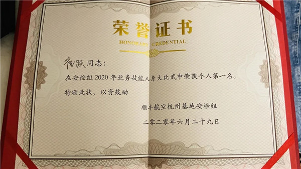 此次在人身检查的项目中获得第一名,对我而言,是一种珍贵的肯定和认可,也是职业道路上又一成长的印迹,很开心。我想对自己说梦想值得尊重,汗水值得肯定,要努力,为自己……